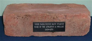 This is an actual brick from Shibe Park/Connie Mack Stadium. It was purchased from a Mr. Steve Stewart of Chalfon, PA by the Philadelphia A's Historical Society in Hatboro in 2002. Mr. Stewart had purchased it along with many other such bricks in Aug. 1982 from Geppert Bros. Construction Company of Colmar, PA who did the demolition of the stadium, to make a patio in his backyard. This is where the bricks sat until 2002. When he realized the historical significance of them he decided to sell them to the Philadelphia A's Historical Society. The brick has a trophy label on the front describing what it is and comes with a Certificate of Authenticity and a letter from Mr. Stewart of Chalfont, PA, attesting to his purchase of the bricks. This is a great piece of baseball's past to put on display. One sold at auction for over $500.