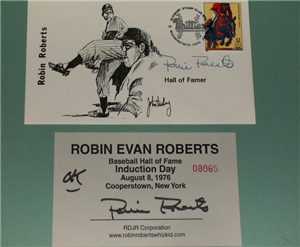 This is an autographed Robin Roberts cachet to commemorate his induction into the Hall of Fame and a Hall of Fame Induction Day ticket signed by Robbie.