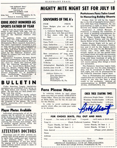The Philadelphia A's Elephant Trails newsletter was a popular item and some reprints are available. Here we have one autographed by Bobby Shantz.