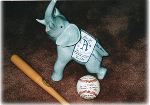 This beautifully crafted elephant is signed by 16 players: 15 from the old Philadelphia A's and one by Mickey Vernon, 2 time AL league battling champ for the Washington Senators. The A's players are: Forrest "Spook" Jacobs, Morrie Martin, Randy Gumpert, Dick Adams, Al Brancato, Bill Hockenbury, Irv Hall, Billy Werber, Lou Limmer, Gus Zernial, Eddie Joost, Bobby Shantz, Bill Renna, Carl Scheib, Joe Astroth and Allie Clark.