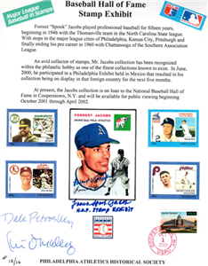This is a VERY RARE and UNIQUE collector's item. It is an 8 x 10 commemorative of former Phiadelphia A's player, FORREST "Spook" JACOBS rare baseball stamp collection going on display at the Baseball Hall of Fame in Cooperstown NY. "Spook" was a 2nd baseman for the Phila. A's and during his playing career he collected baseball stamps from all over the world. His is said to be the largest and rarest of its kind in the world. In 2001, the Baseball Hall of Fame decided to make space in their museum to exhibit this amazing collection. It was on display in Oaxaca, Mexico and to have it moved to Cooperstown was going to cost money. So up to the plate stepped former Los Angeles Dodgers owner Peter O'Malley who financed the move and it went on display for a year starting on October 1, 2001. This has a Baseball Hall of Fame postage stamp on it and is cancelled with the commemorative date by the Cooperstown, NY Post Office. This commemorative is autographed by "Spook" JACOBS as well as PETER O'MALLEY and DALE PETROSKY, the president of the Baseball Hall of Fame.