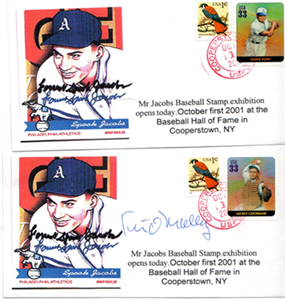 The third and fourth on the right commemorate the great battery of Hall of Fame pitcher Robert Moses "Lefty" Grove and Hall of Fame catcher Mickey Cochrane. Both signatures on the cachets are facsimile autographs.
