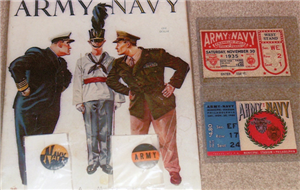 This is a program from Nov. 30, 1946 and two tickets from the Army-Navy Games played in Philadelphia, PA. The top ticket is from the Nov. 30, 1935 game played at Franklin Field won by Army 28-6. And the bottom ticket is from the Nov. 30, 1946 game played at Municipal Stadium also won by Army 21-18. Both tickets are in great shape on the front display side but the backs have some paper torn off from where it looks like they may have been glued in a scrap book at one time. Program is also in great shape with one slight tear at top seam. Included are an Army and a Navy button.