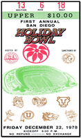 This is a ticket from the Dec. 22, 1978 Holiday Bowl Inaugural game played in San Diego, California which was won by Navy 23-16 over BYU. The bowl continues to this day.